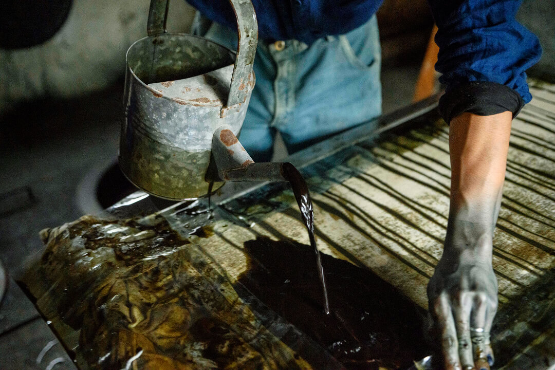 草衣so-iでは、化学染料を一切使わずに本藍での注染で衣服に仕立てる生地やタペストリーを染めています。型付けした生地にヤカンとよばれるジョウロのような道具で藍を注ぎます。