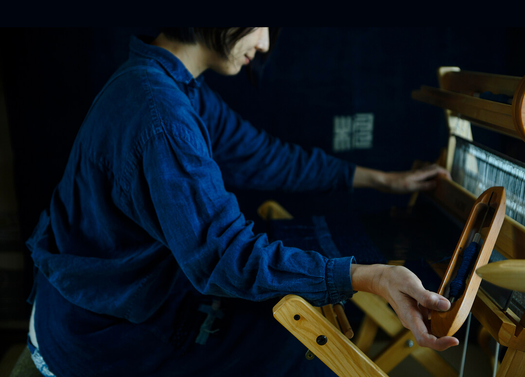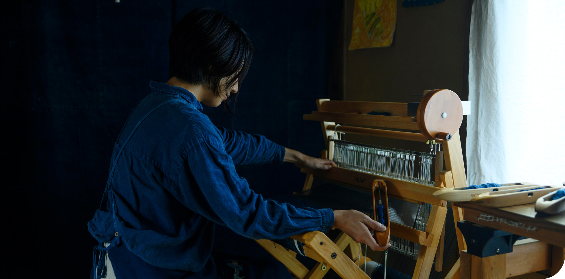 自然のままの色を生かした糸、藍で染めた糸、自分たちの畑で育てた綿などを素材として風合いを大切に、布を織っています。